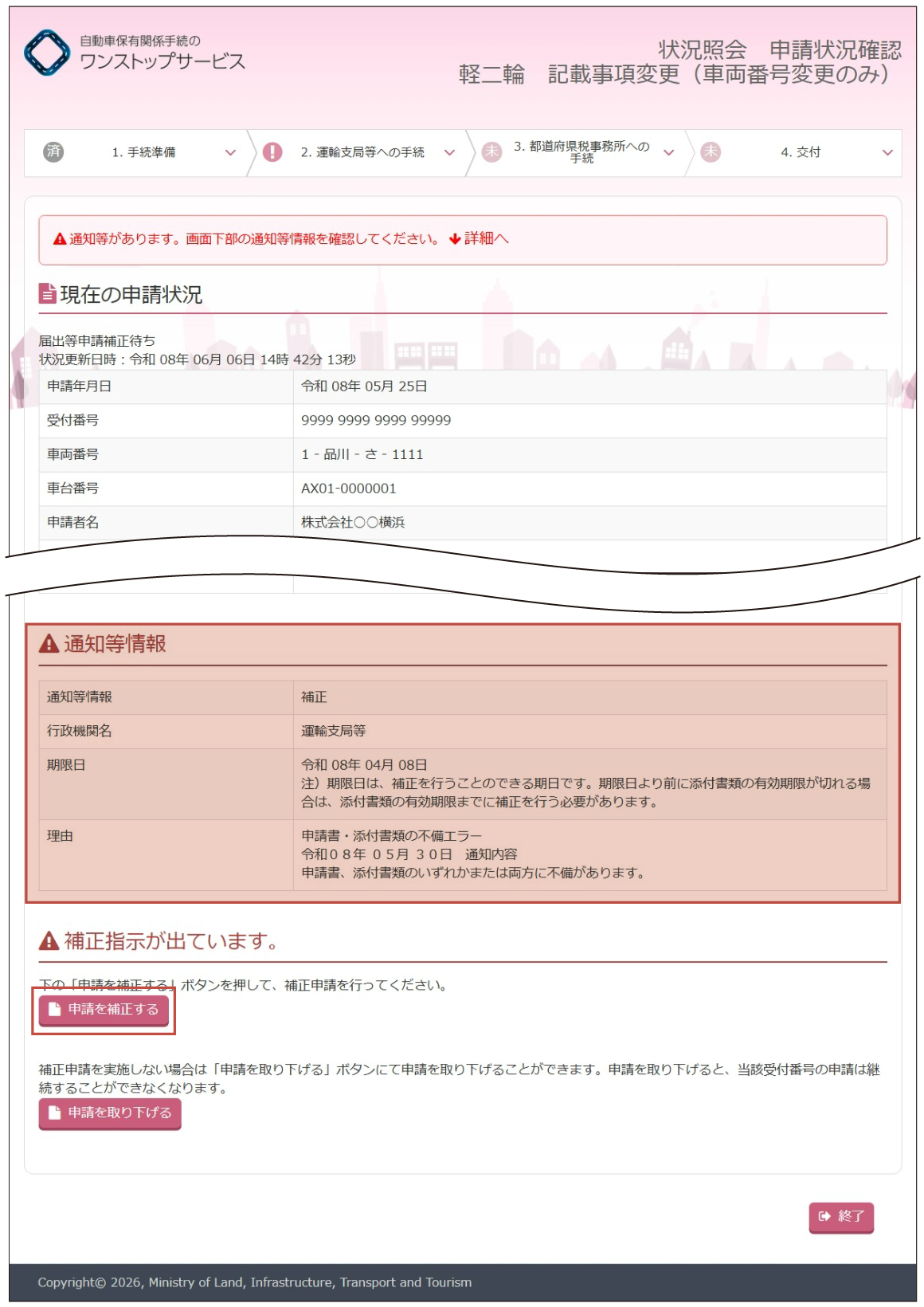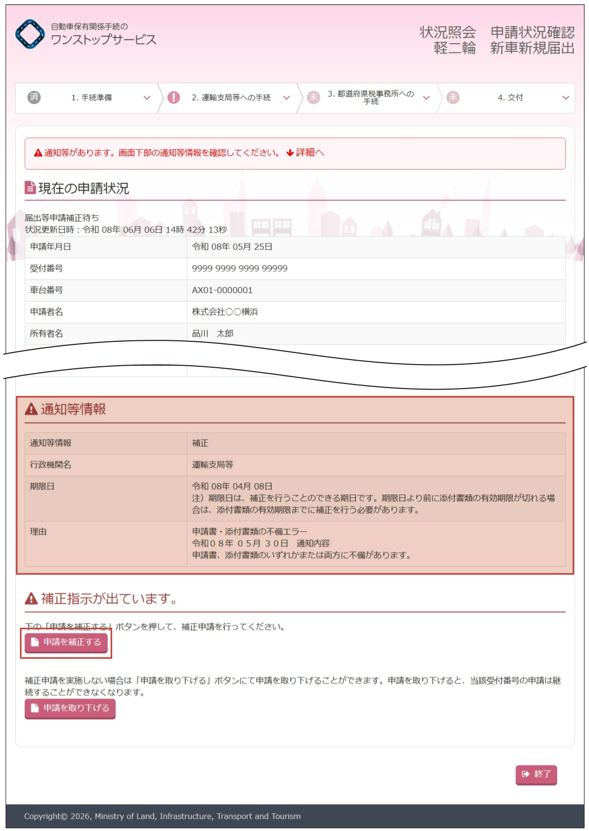 永久抹消登録(還付なし)の申請を行ったあと、各審査で申請内容の訂正が必要となった際には「補正」を行います。