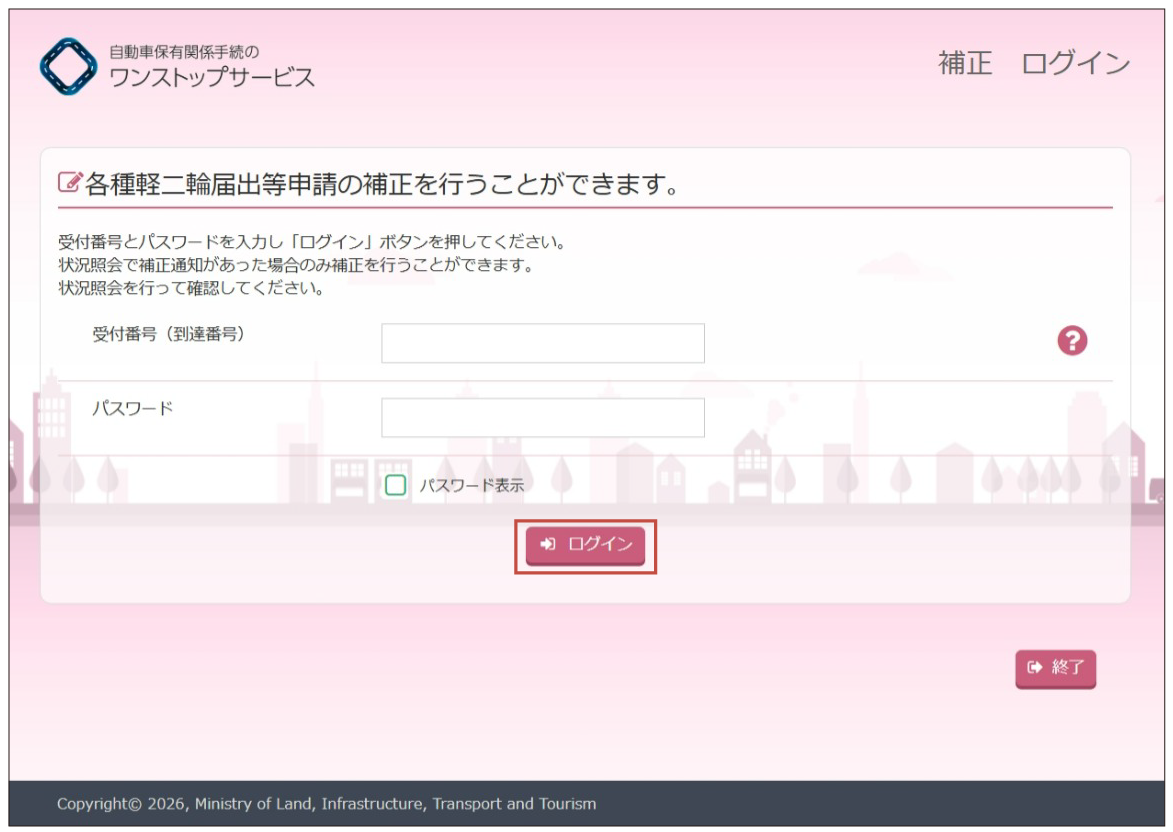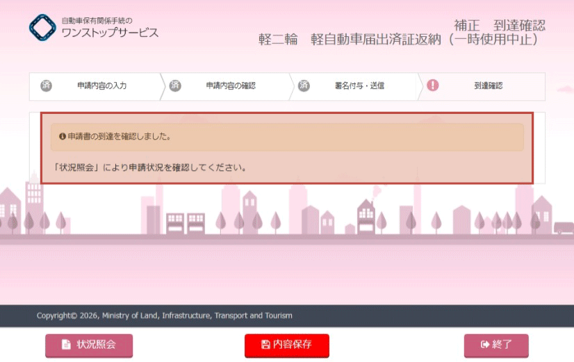 『補正到達確認』画面より、申請書が正常に到達したことを確認します。