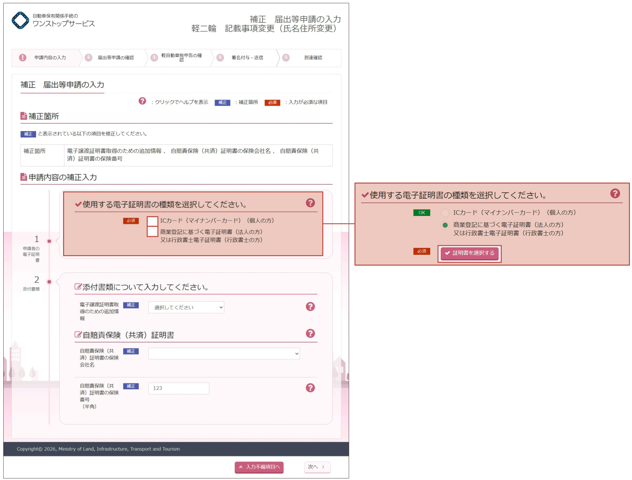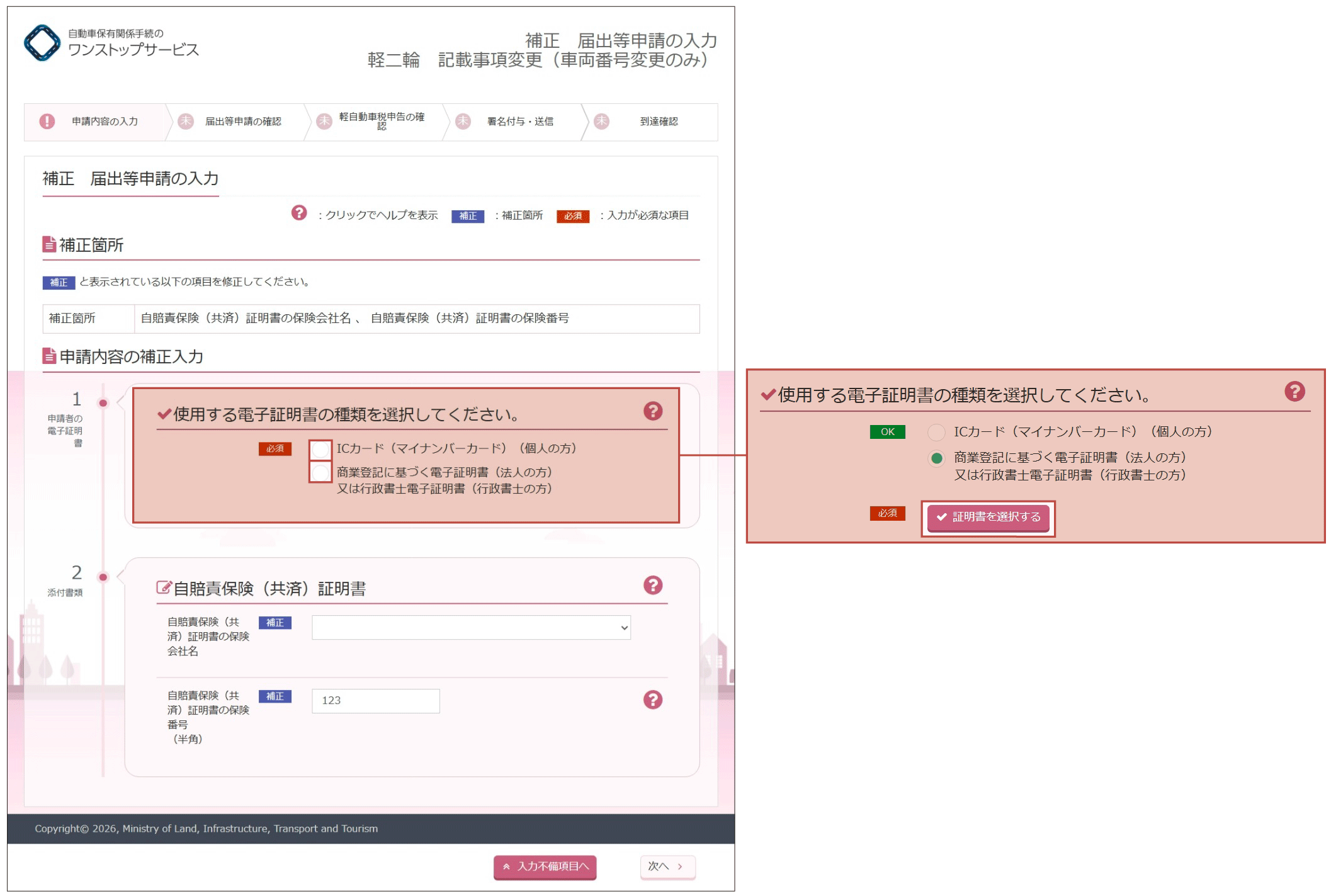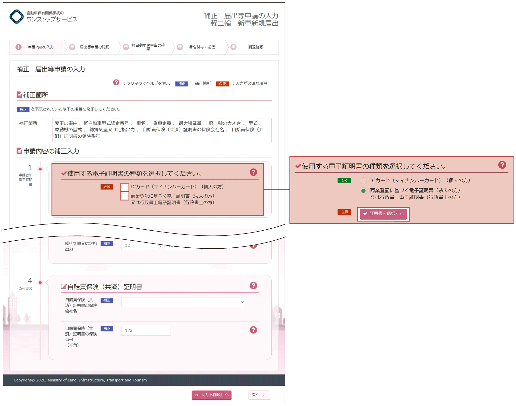 - 自賠責保険(共済)証明書の補正が指示された場合は、自動車販売店に相談して登録情報処理機関に提供された自賠責保険(共済)証明書を修正し、『補正届出等申請の入力』画面の「保険会社名」及び「保険番号」を入力してください。