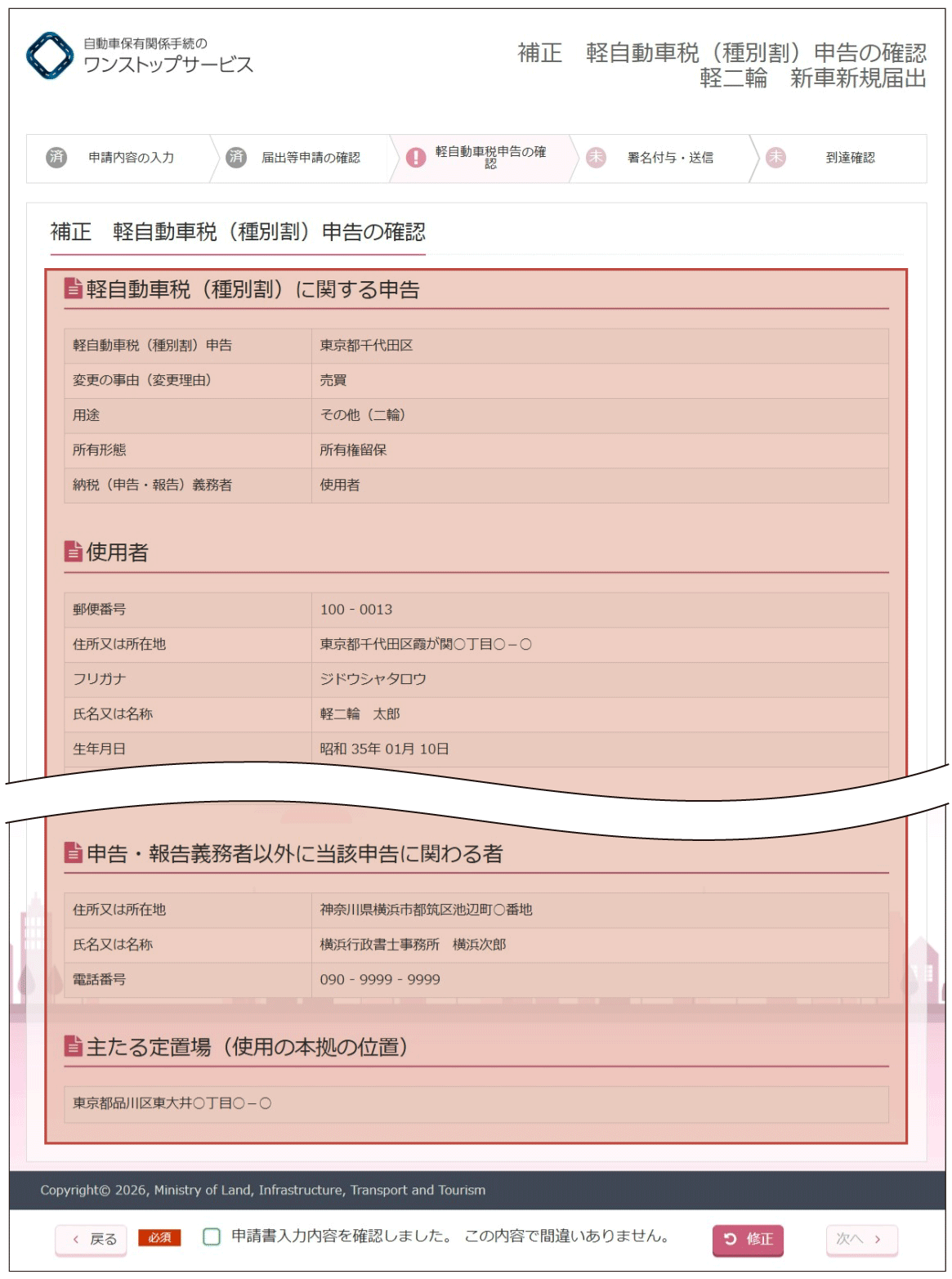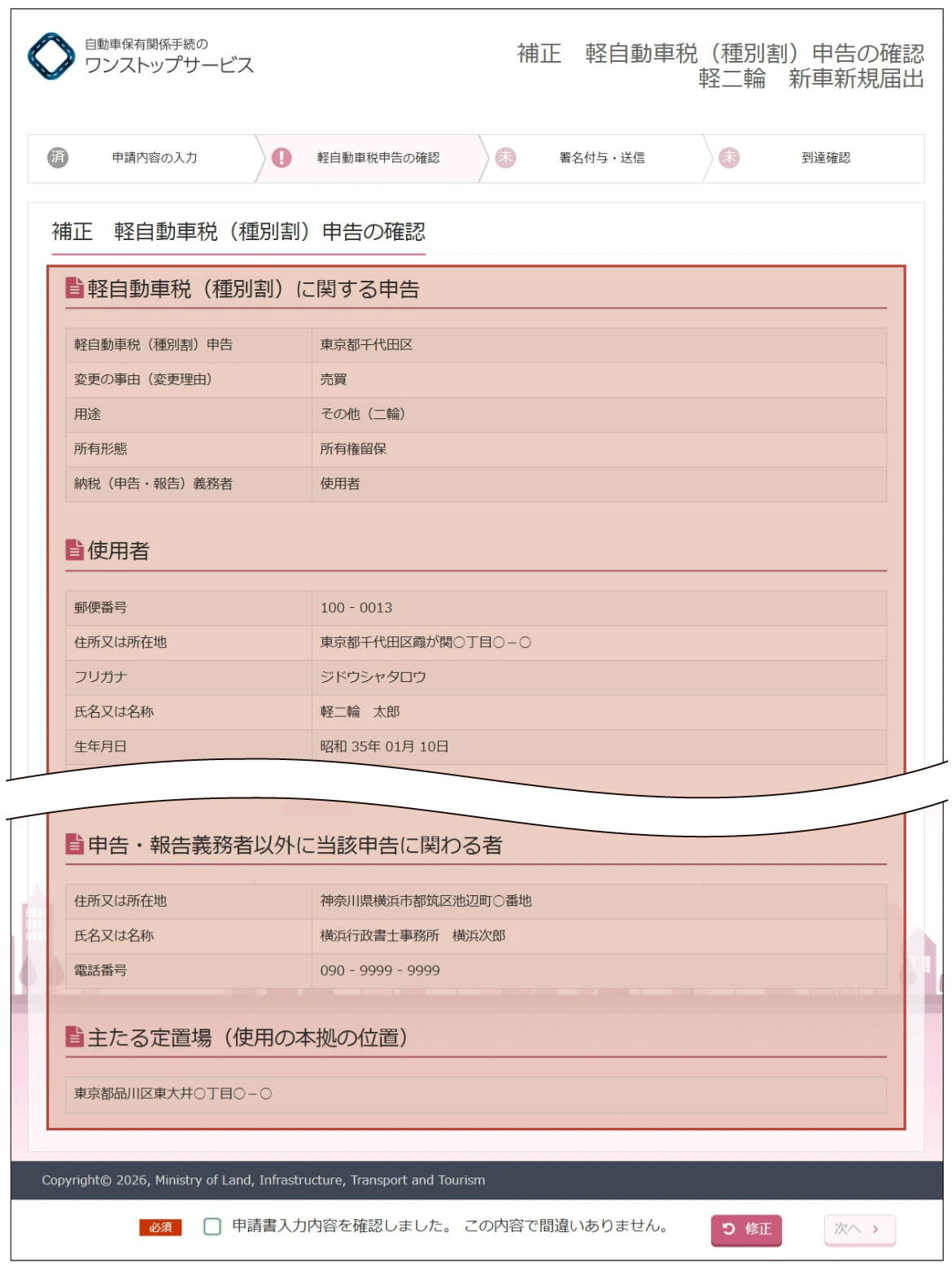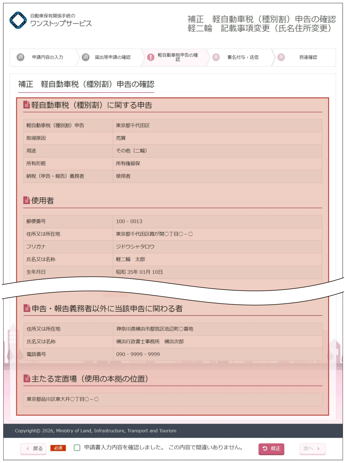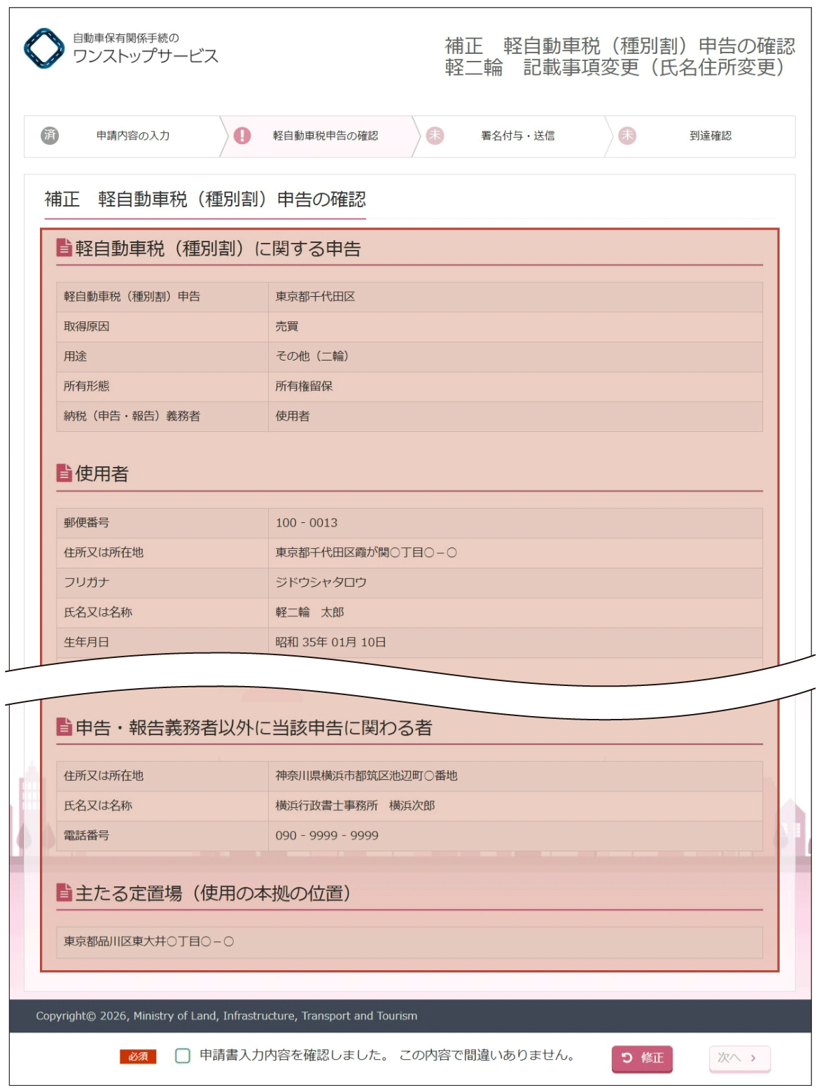(2)『補正軽自動車税(種別割)申告の確認』画面より、入力内容の確認を行います。