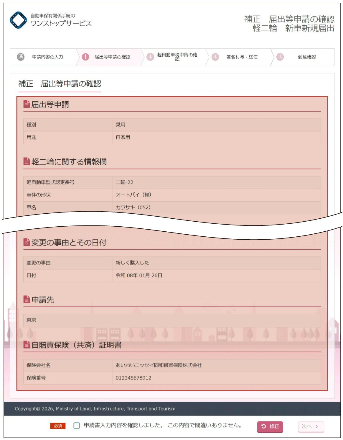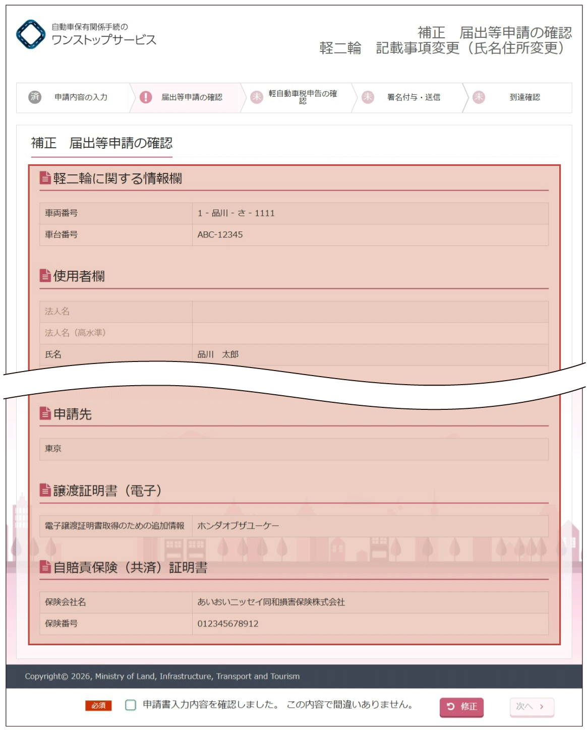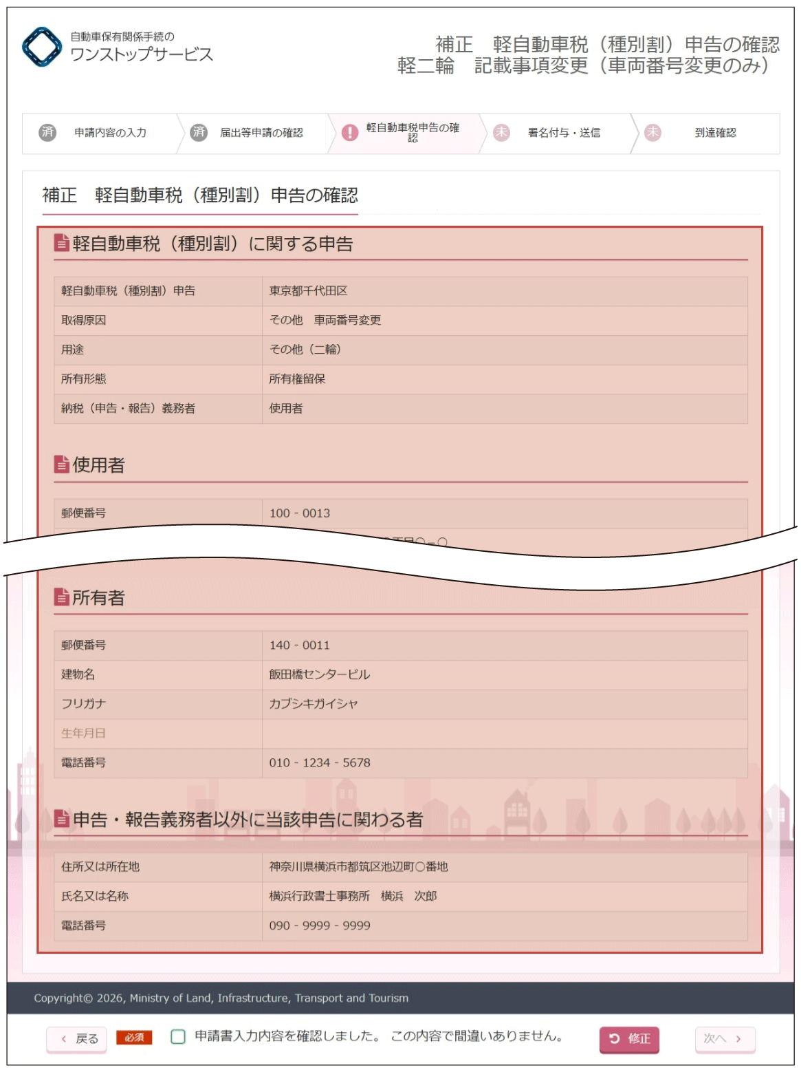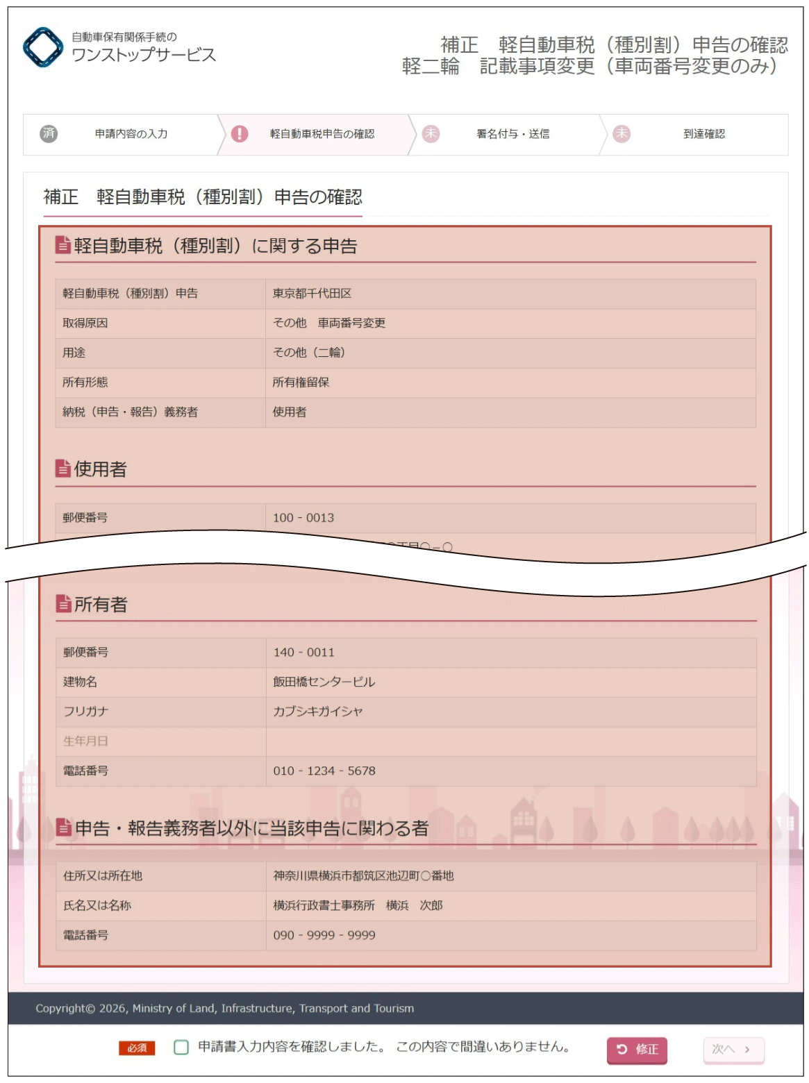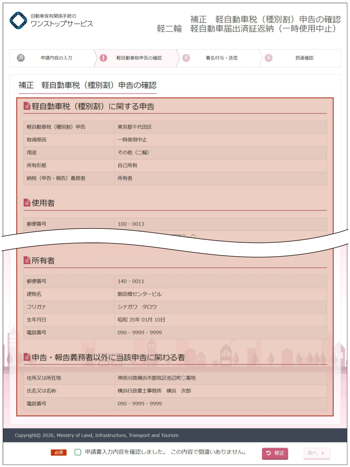 (2)『補正軽自動車税(種別割)申告の確認』画面より、入力内容の確認を行います。