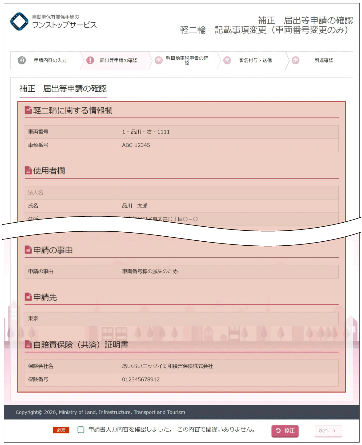 (2)『補正自動車保管場所証明申請の確認』画面より、入力内容の確認を行います。