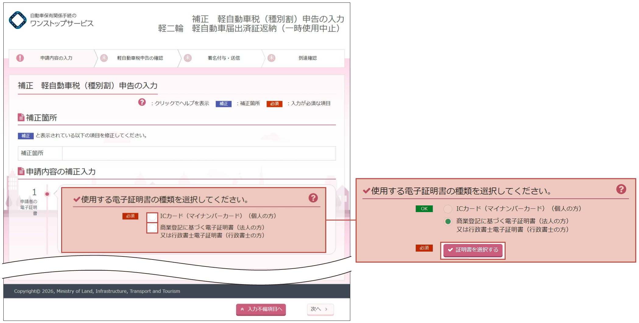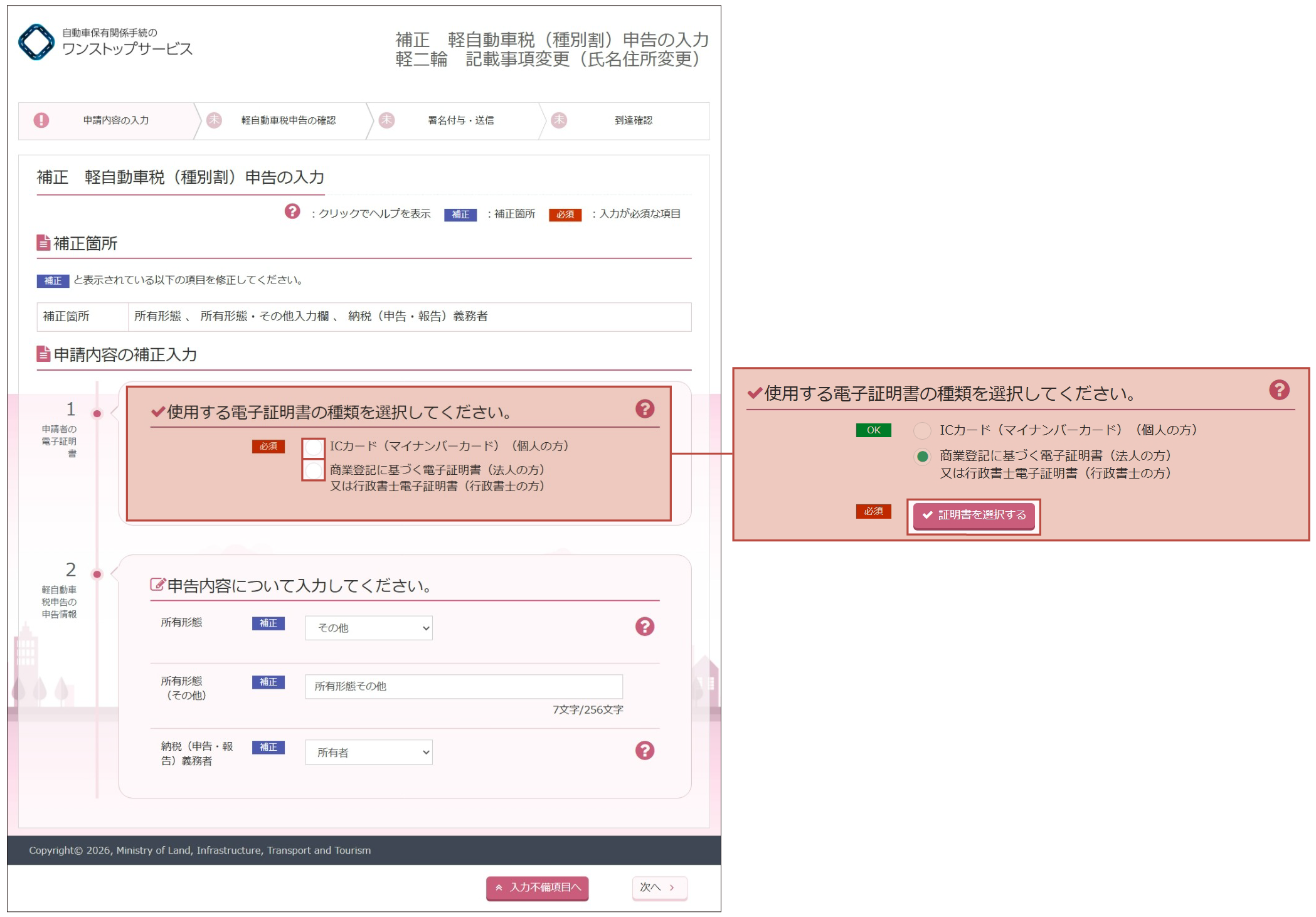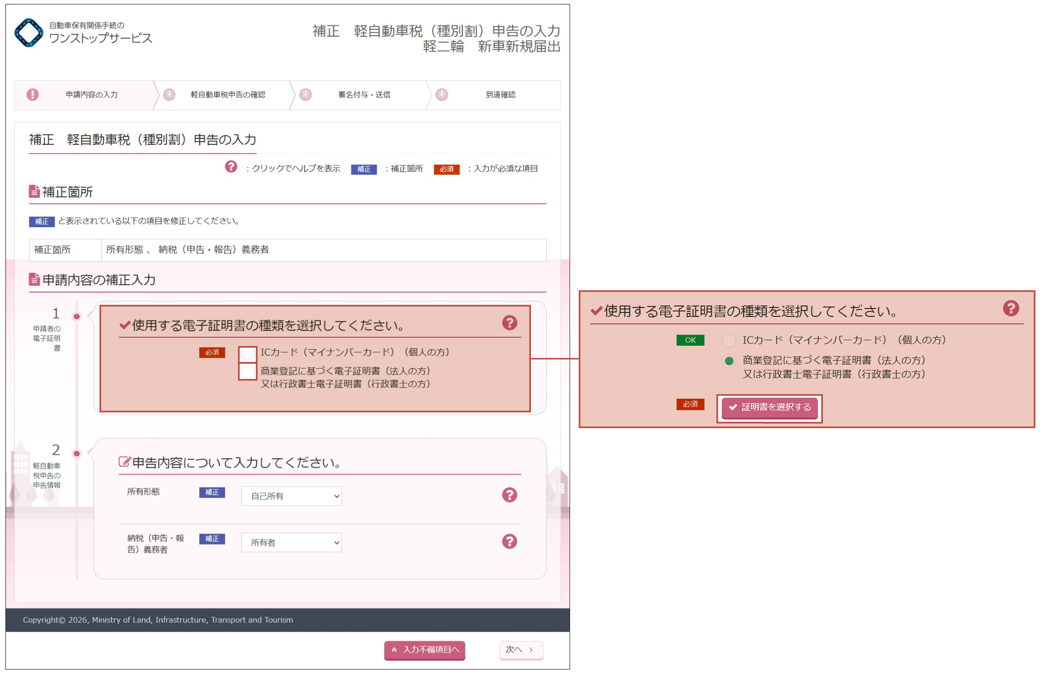 - 譲渡証明書情報の補正が指示された場合は、以前の所有者に相談の上、登録情報処理機関に登録された譲渡証明書情報を確認してください。