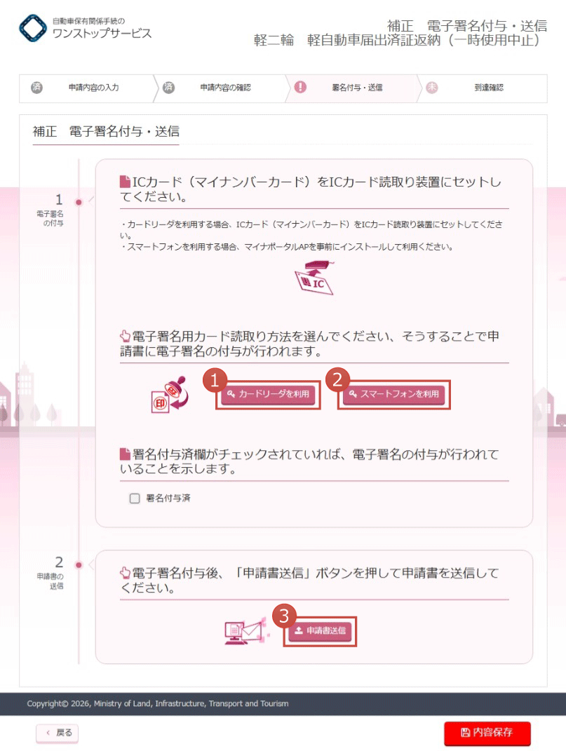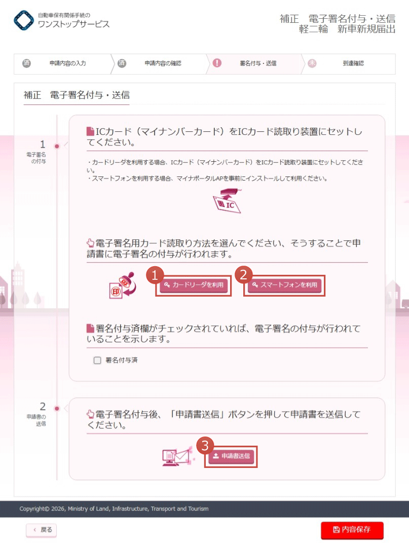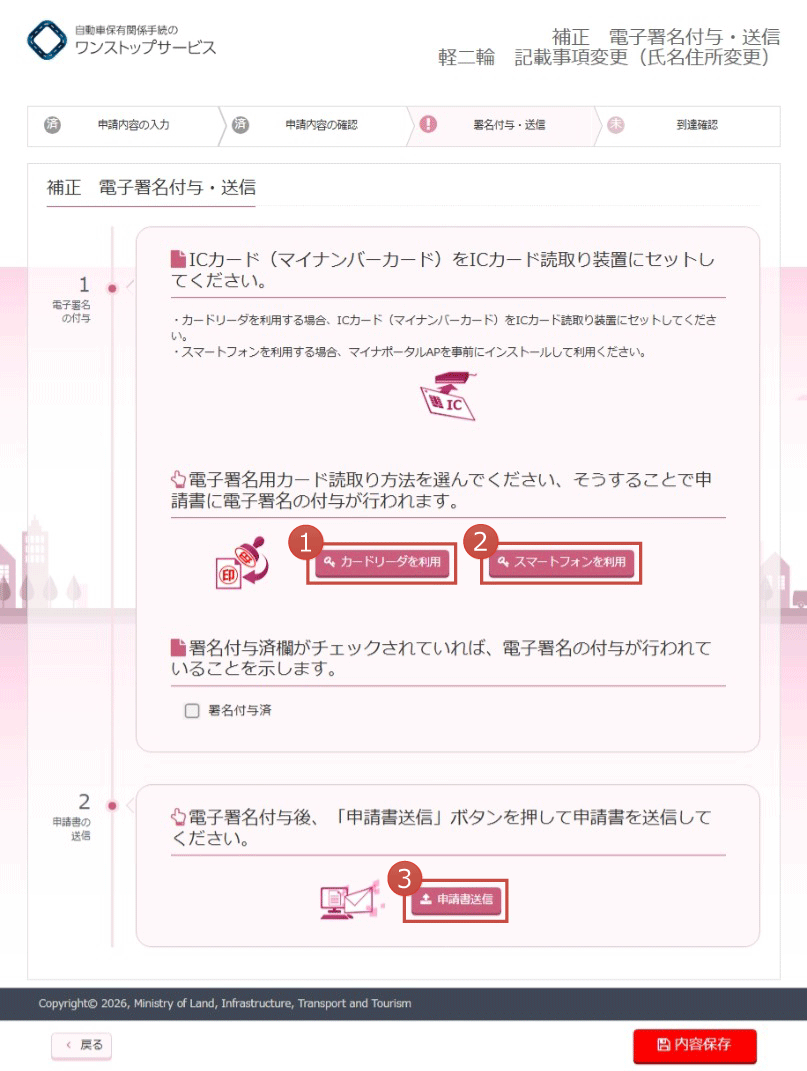 (1)申請の際に使用した申請者の電子署名を付与する際、ICカード(マイナンバーカード)を読み込む方法を、以下から選択します。